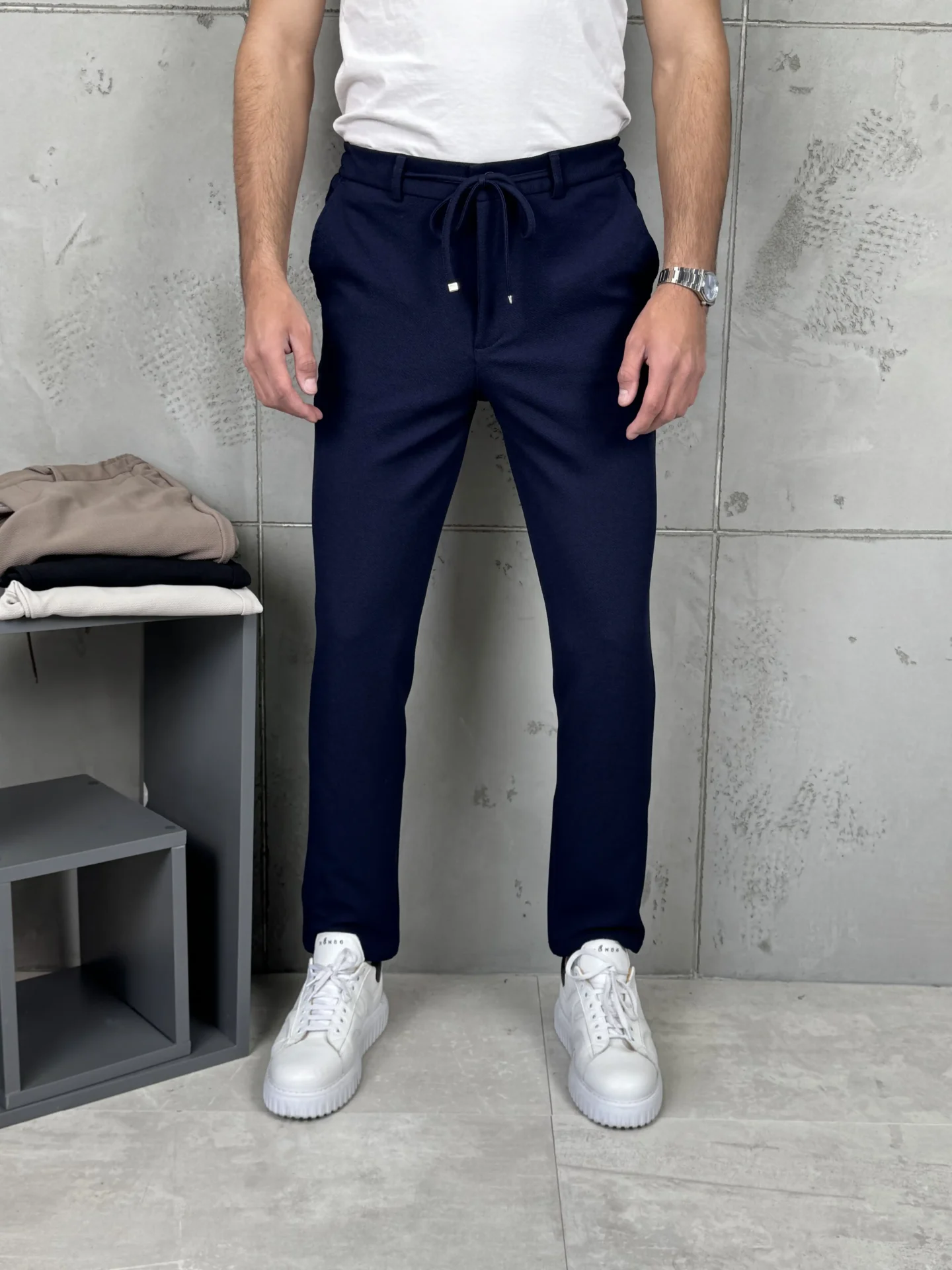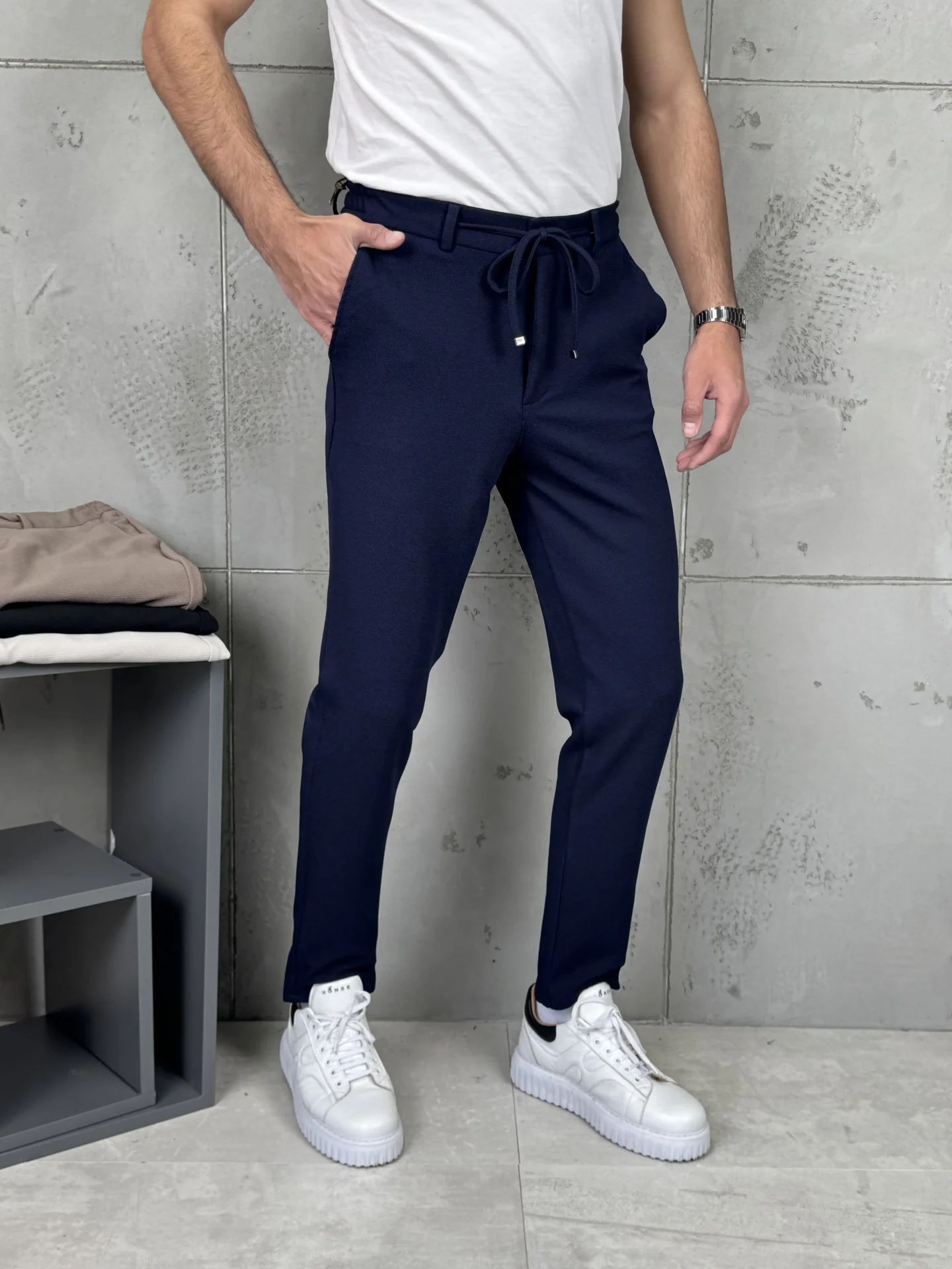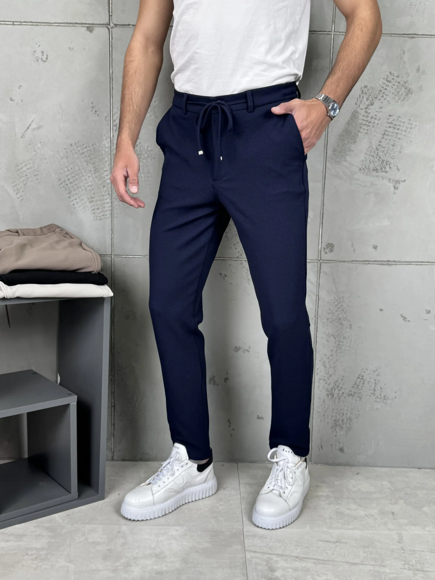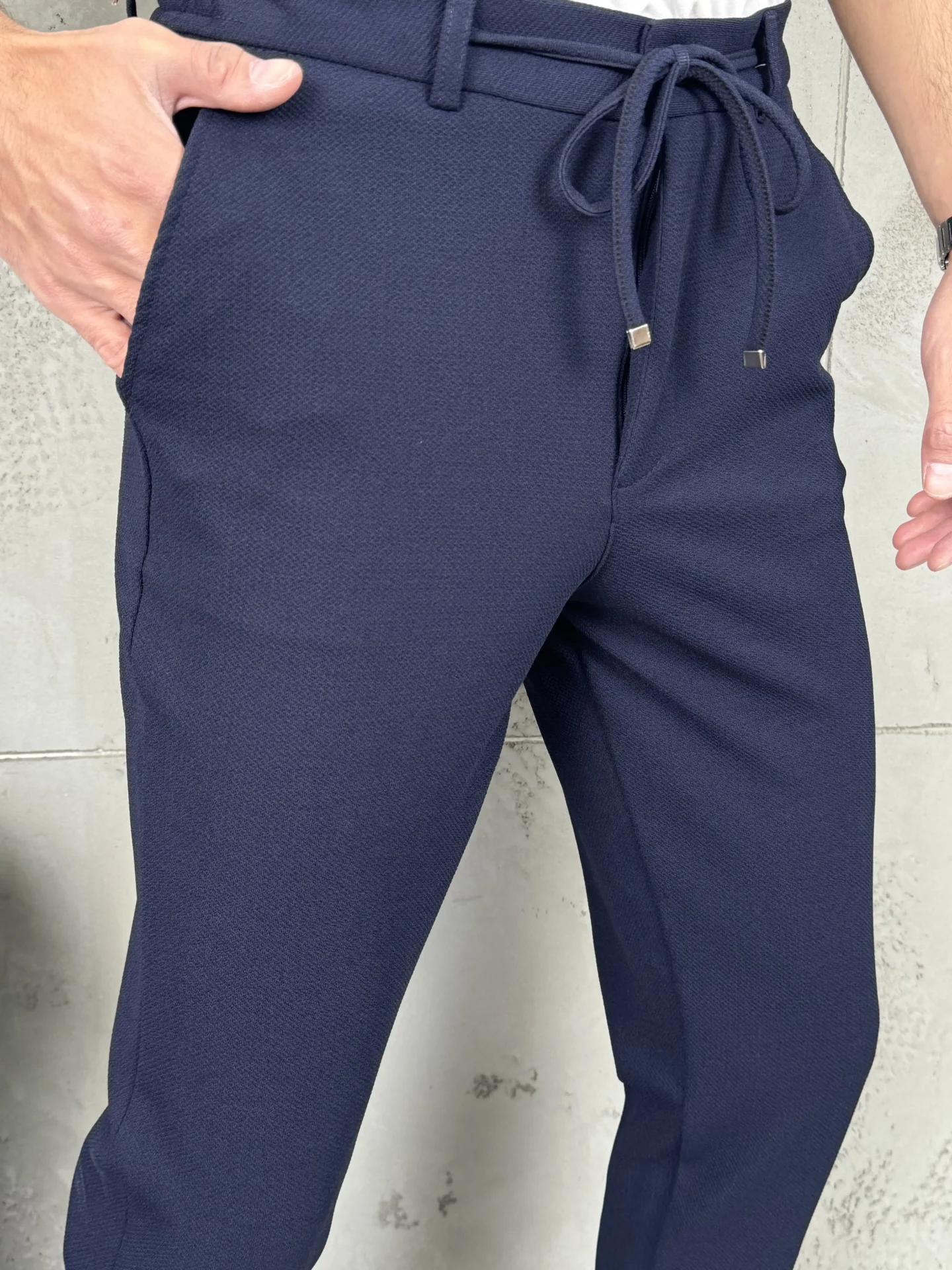 Predstavljamo savršenu fuziju klasike i komfora. Ove pantalone zadržavaju elegantan, sveden kroj, ali ga modernizuju pojasom sa pertlom (drawstring), što ih čini izuzetno udobnim i prilagodljivim. Može se lako kombinovati sa raznim odevnim idejama.