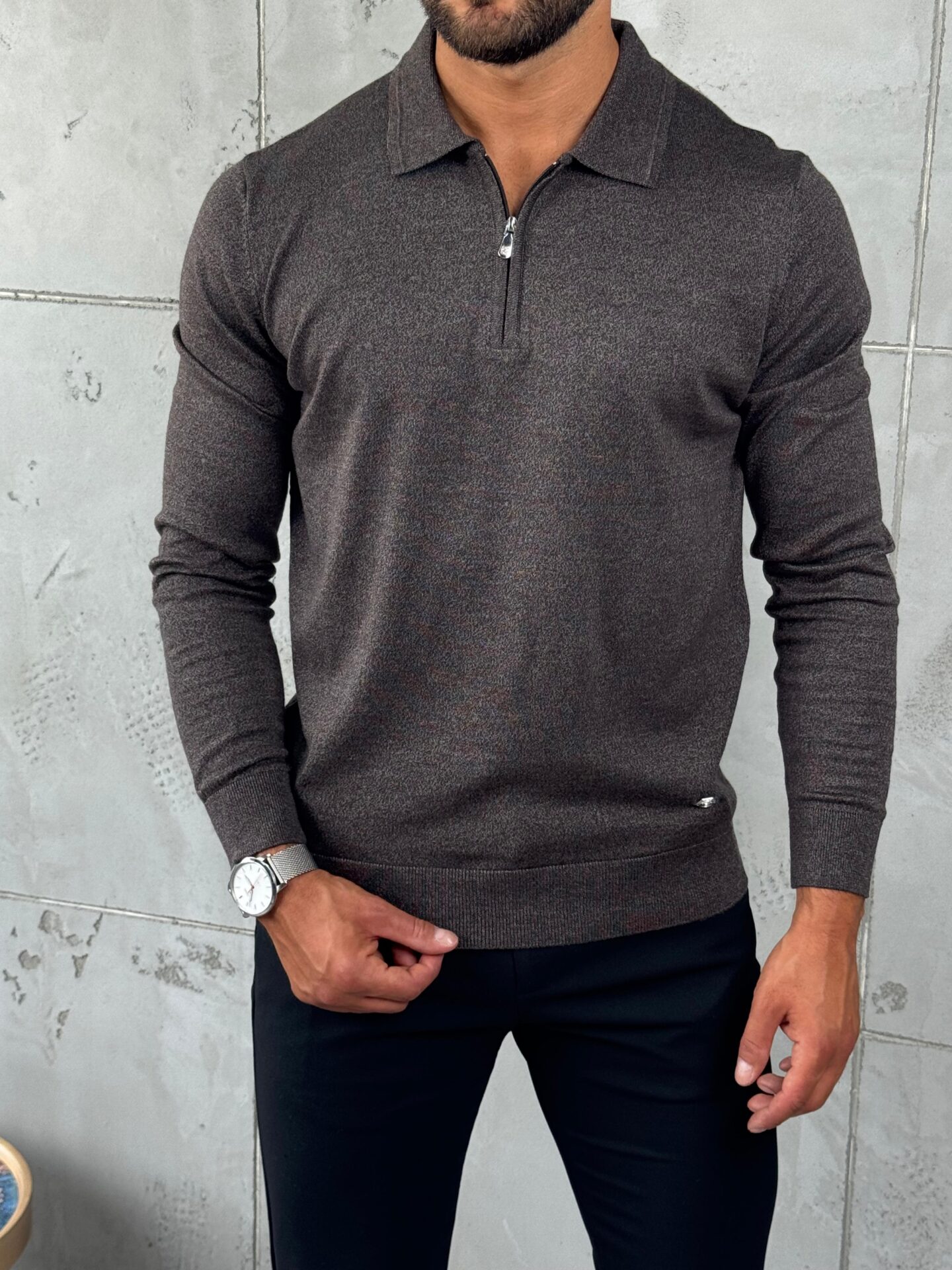 Muški džemper sa polukragom i metalnim zipom u braon boji. Napravljen od 50% pamuka i 50% konca, nudi idealnu ravnotežu topline i udobnosti. Slim fit kroj prati liniju tela i čini ovaj model odličnim izborom za poslovni i casual izgled. Lako se kombinuje sa svetlim ili tamnim pantalonama i patikama.