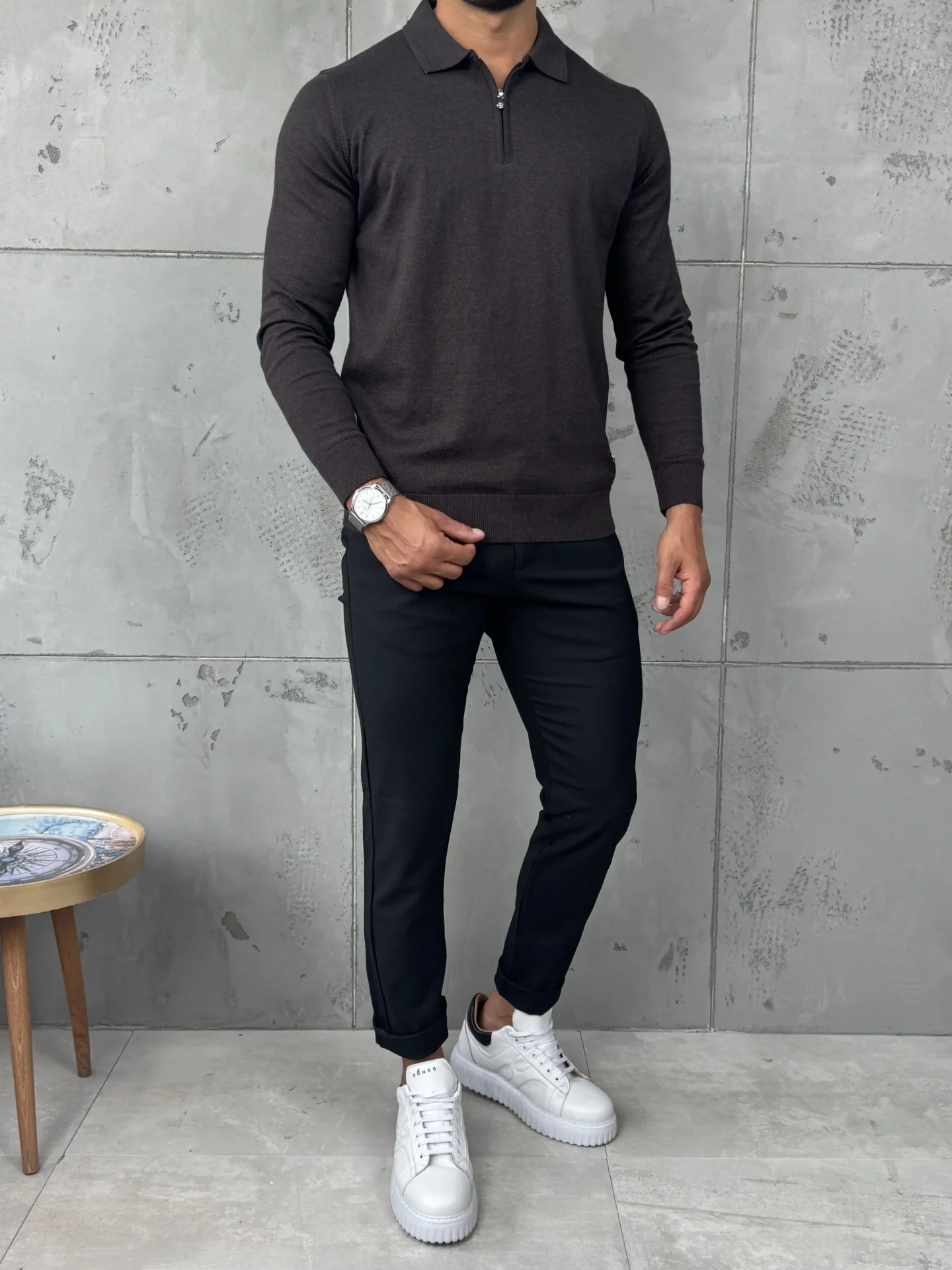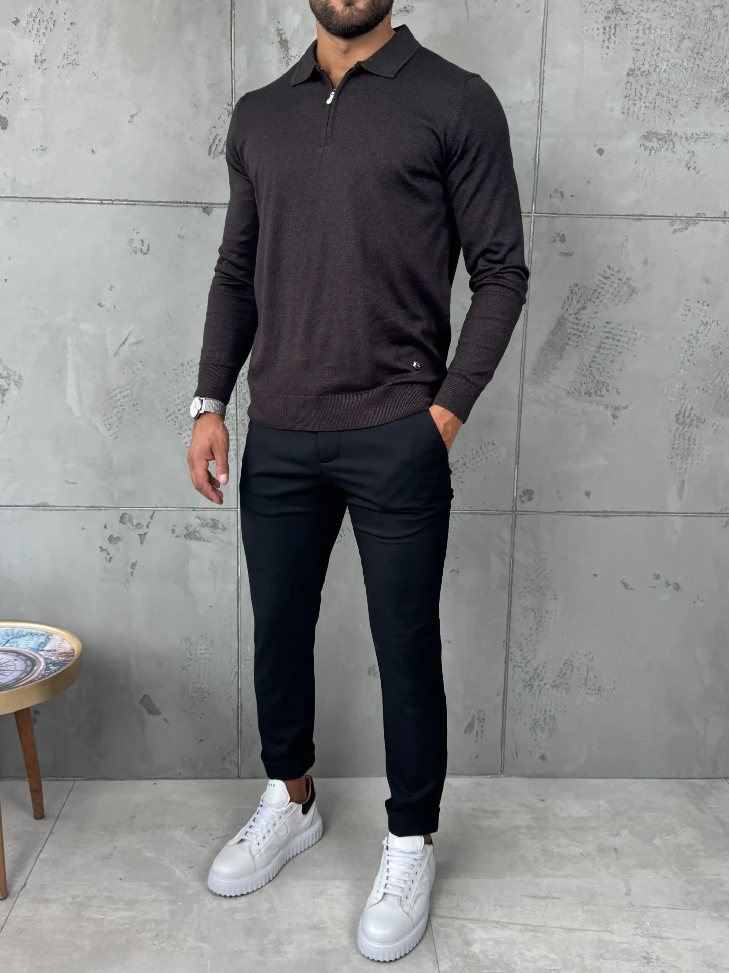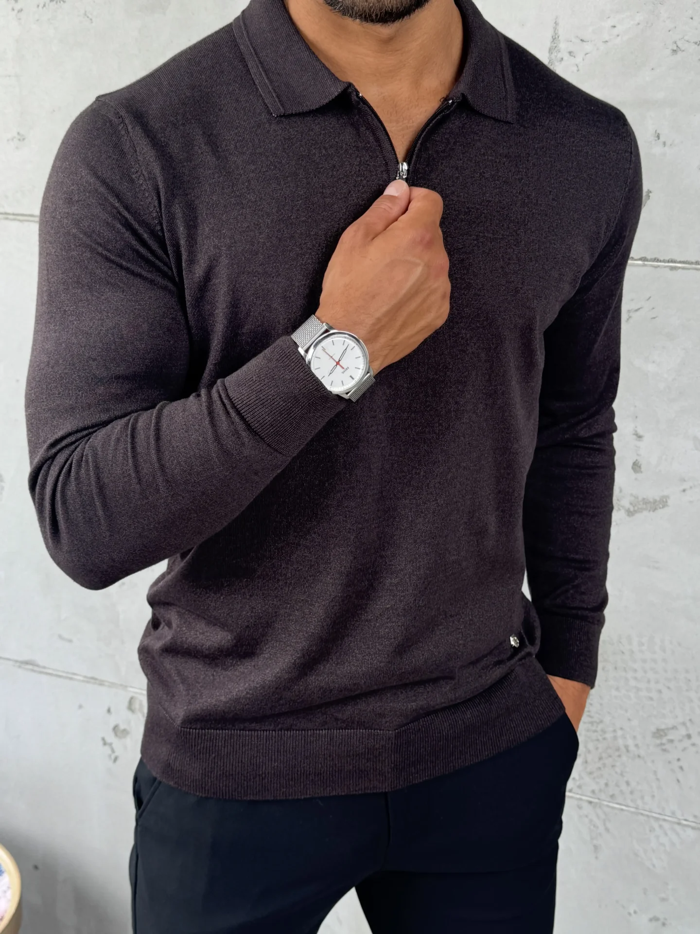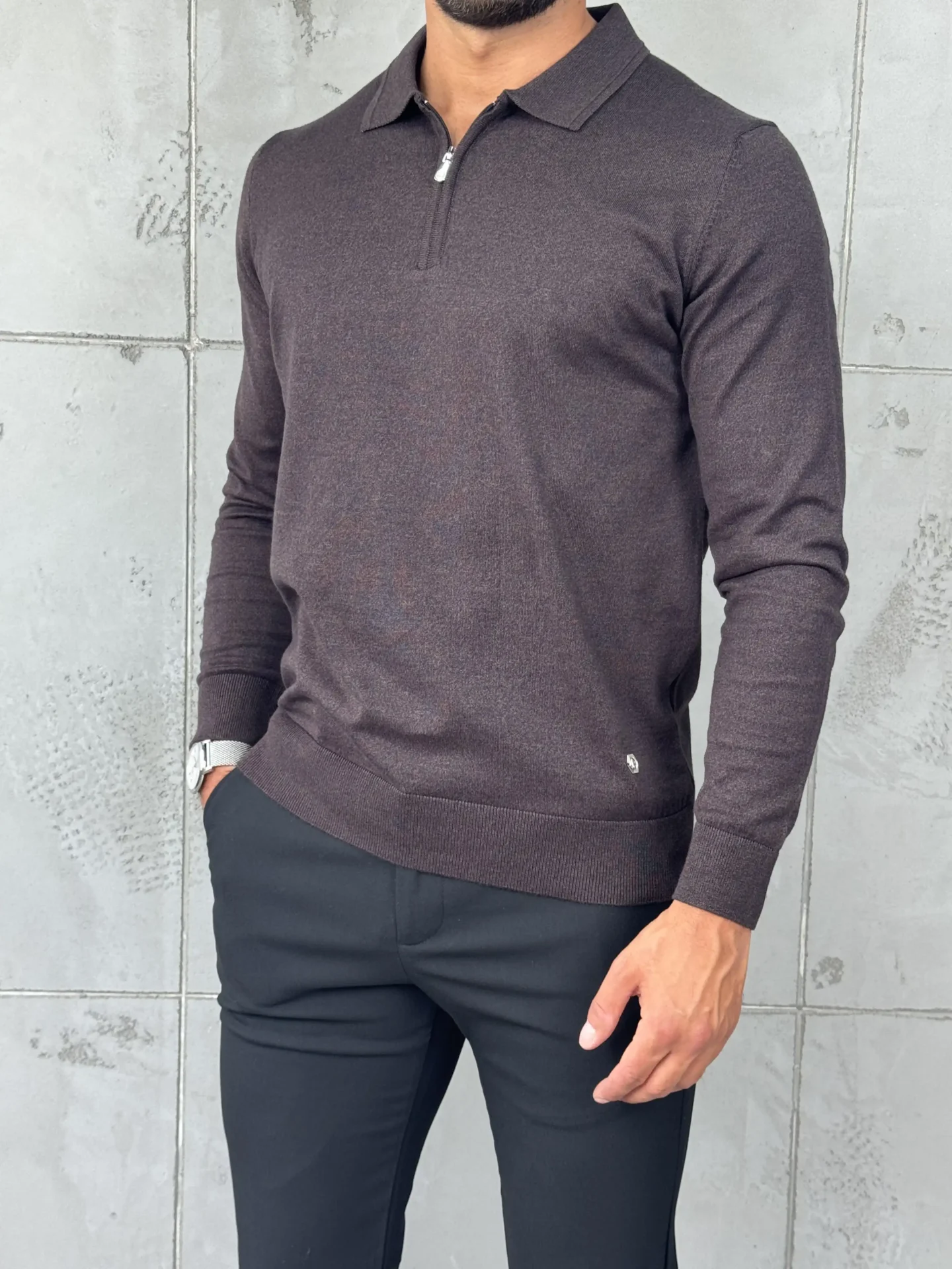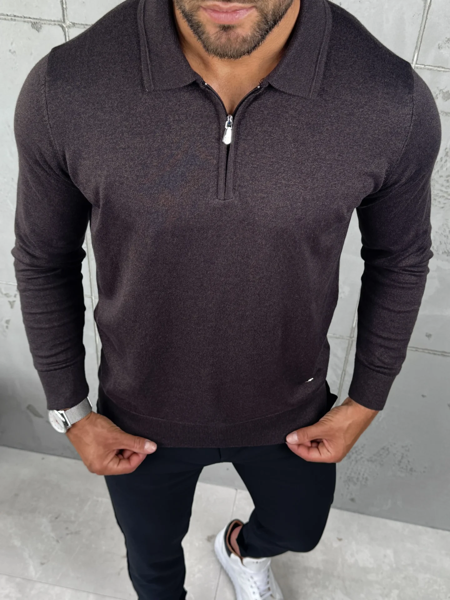Muški džemper sa polukragnom i metalnim zipom u tamnobraon nijansi. Izrađen od 50% pamuka i 50% konca, pruža udobnost i prozračnost, dok slim fit kroj naglašava liniju tela. Odličan izbor za casual i poslovne kombinacije – lako se uklapa uz farmerke, chino ili elegantne pantalone.