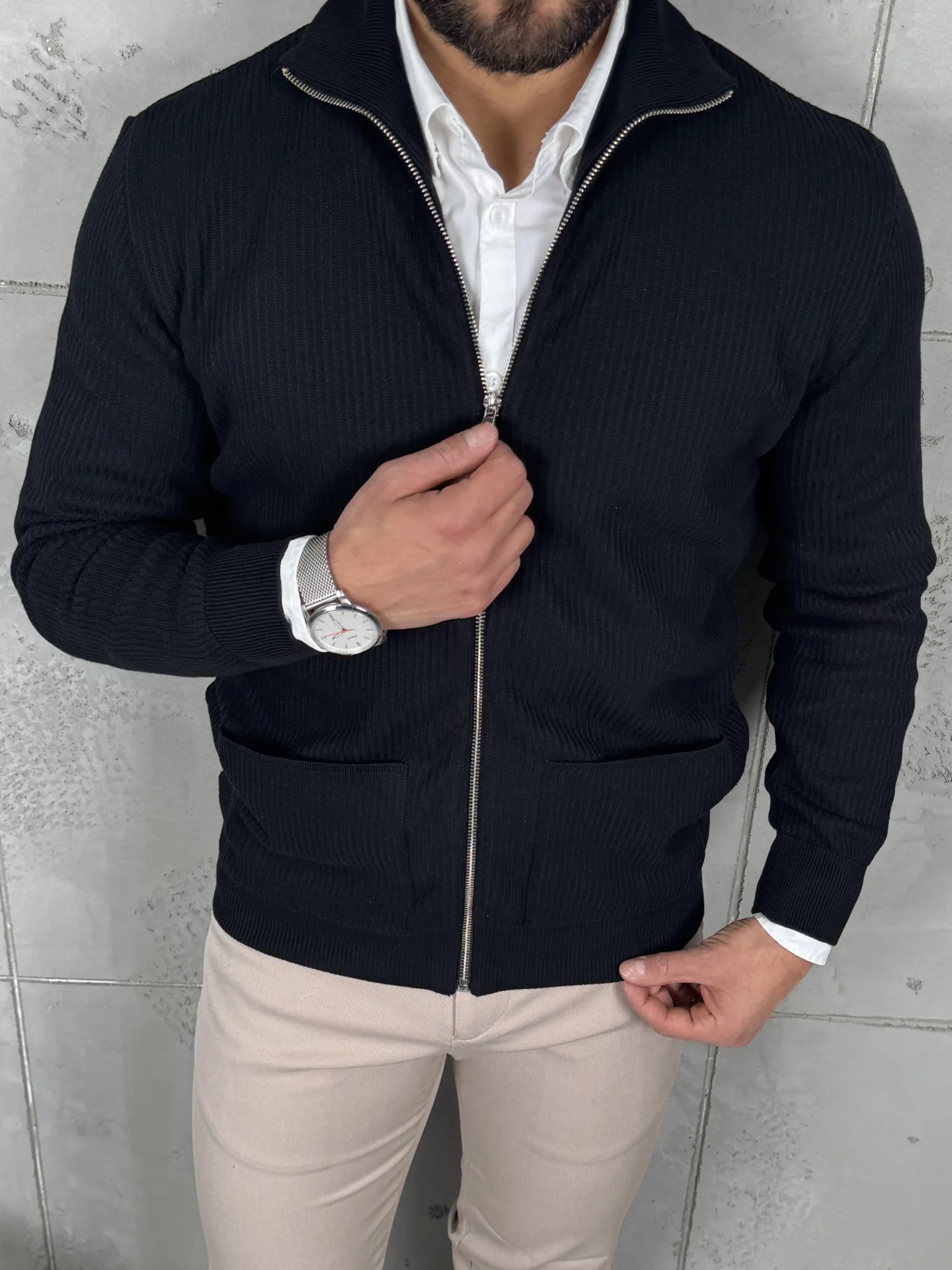 Ovaj PREMIUM crni džemper-jakna je nezaobilazan komad koji nudi maksimalnu eleganciju i svestranost. Poseduje celu dužinu rajsferšlusa (Full Zip), visoku kragnu i praktične prednje džepove, idealne za smart-casual i poslovne kombinacije.