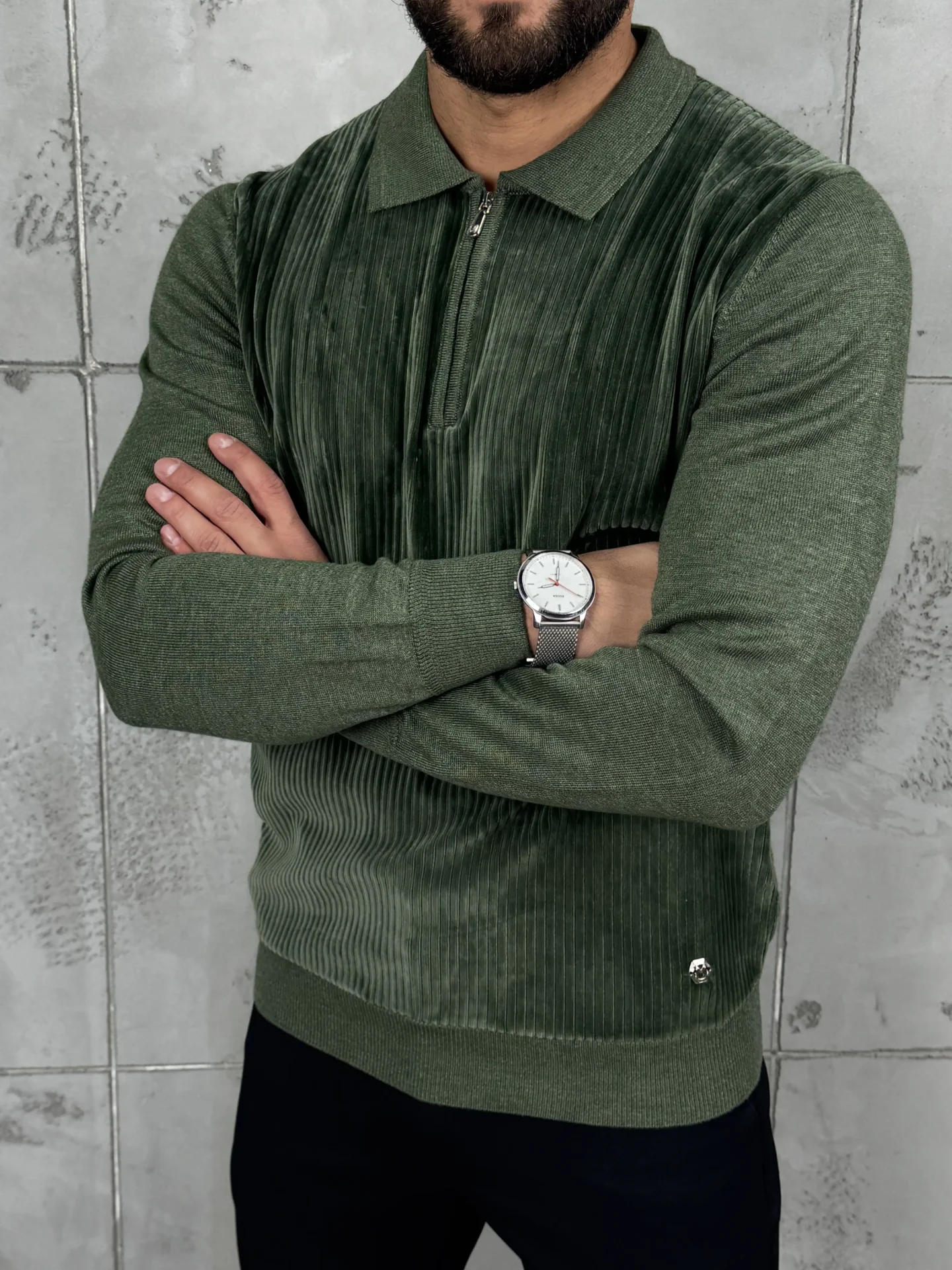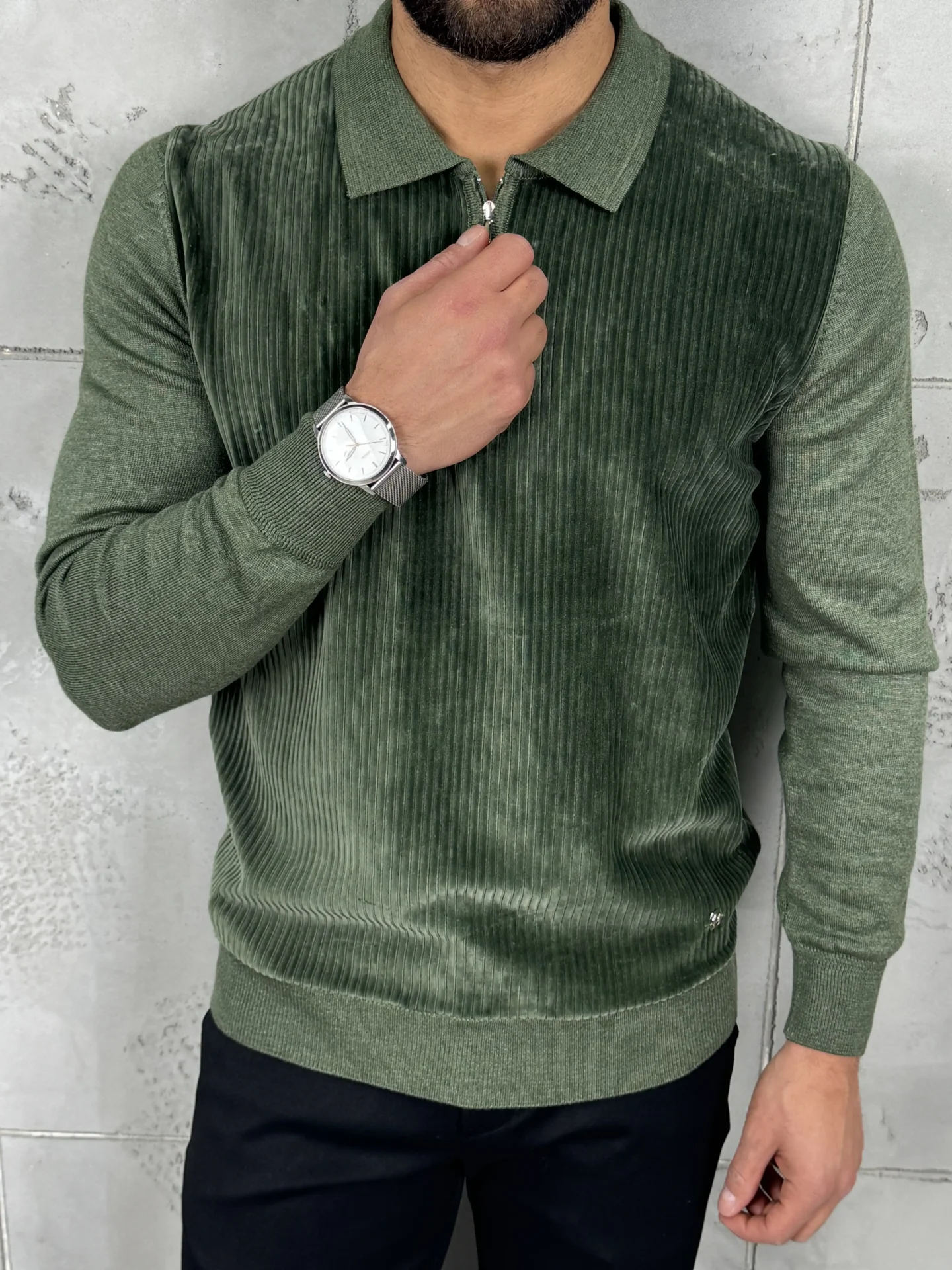 Ovaj PREMIUM džemper spaja jedinstvenu rebrastu somotsku (plišanu) teksturu na prednjem delu sa klasičnom Polo kragnom i rajsferšlusom.